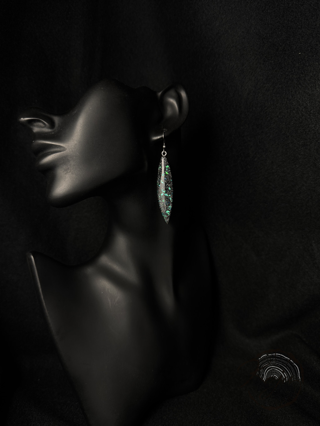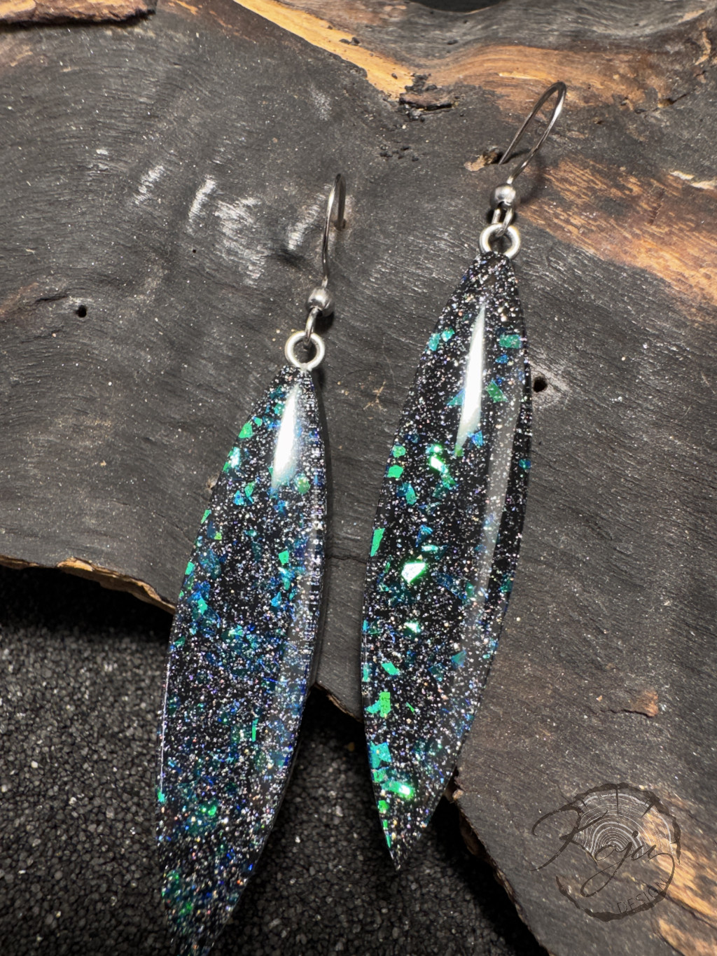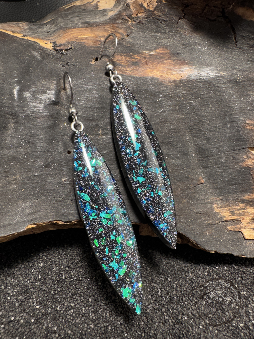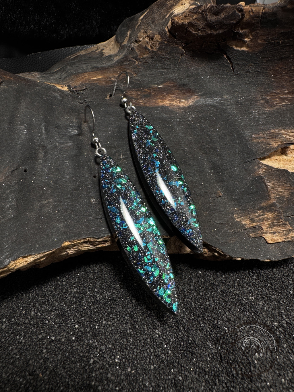 Fekete hátterű íves fülbevaló, csillogó részletekkel, epoxy gyantából. Az ékszerben különleges hatású csillogó fólia darabkák adját a szikrázó megjelenést.