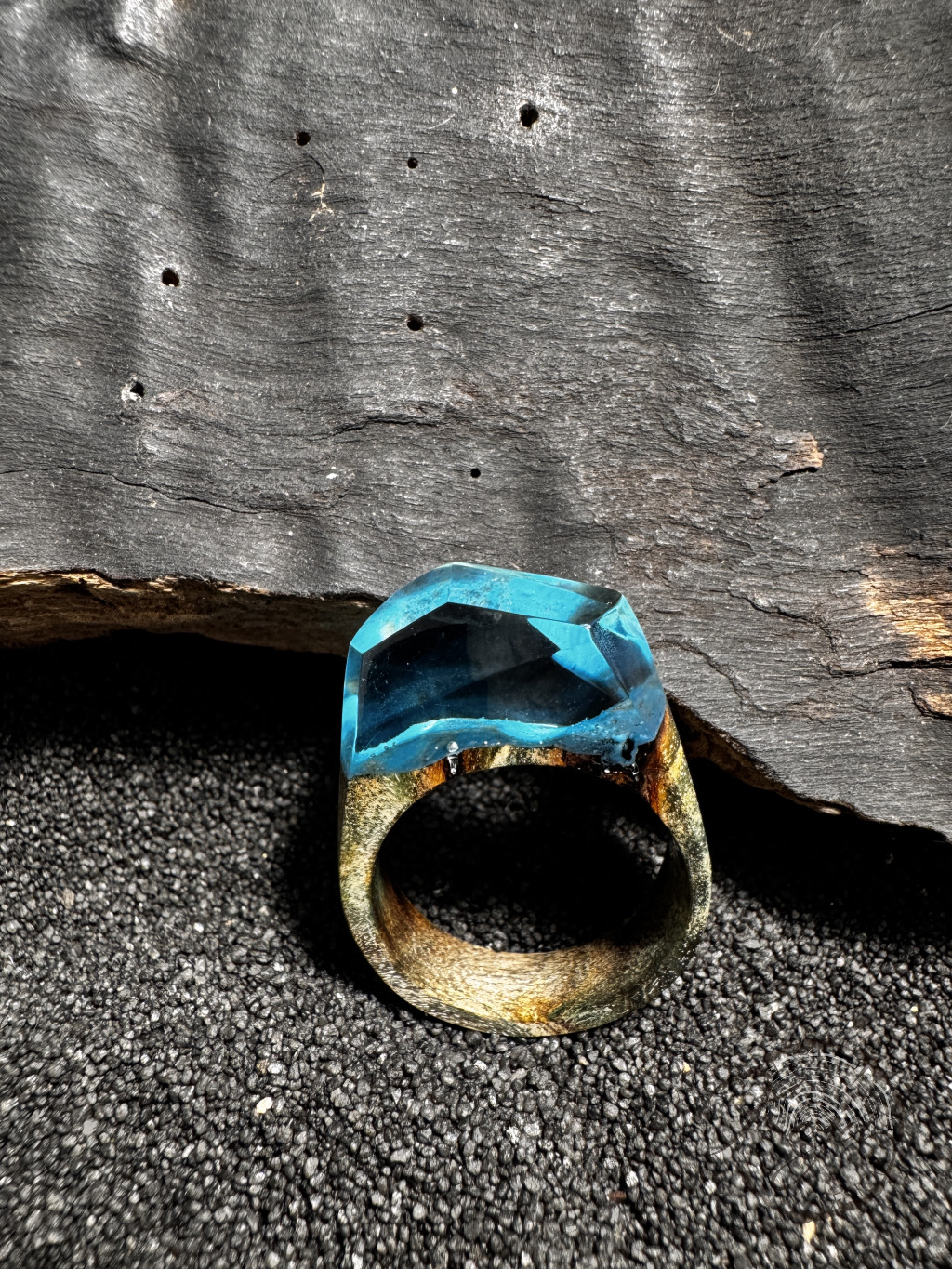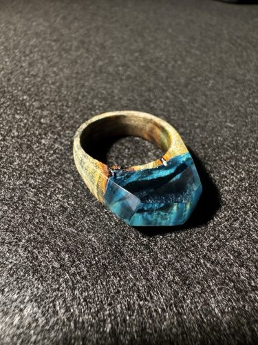 Különleges szögletes kialakítású, modern darab. Stabilizált nyárfa alap és áttetsző kék epoxy gyanta alkotja. Az igazi varázsa azonban sötétben jelentkezik, amikor a foszforeszkáló hatású gyűrű világítani kezd. Egyedi megjelenésével biztosan felkelti mások érdeklődését és irigy pillantásokat vonz. A gyűrű nemcsak látványos, hanem strapabíró és hosszú éveken át hordható. Kézzel készült, minőségi anyagok felhasználásával, hogy Ön minden alkalommal különlegesnek érezhesse magát. Vásároljon most egyediséget és stílust egyszerre egyetlen termékben!