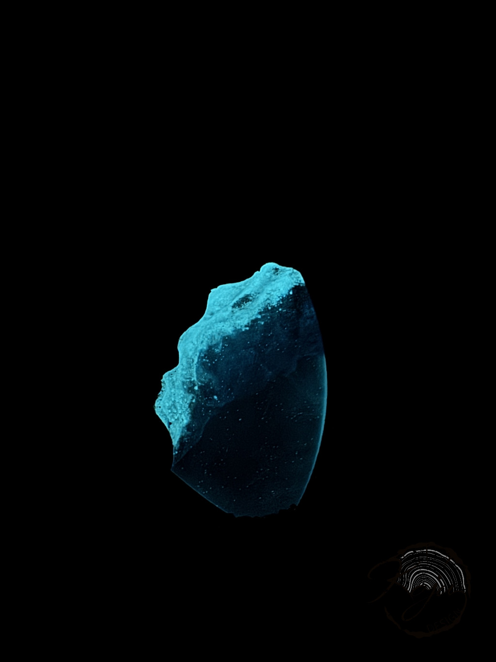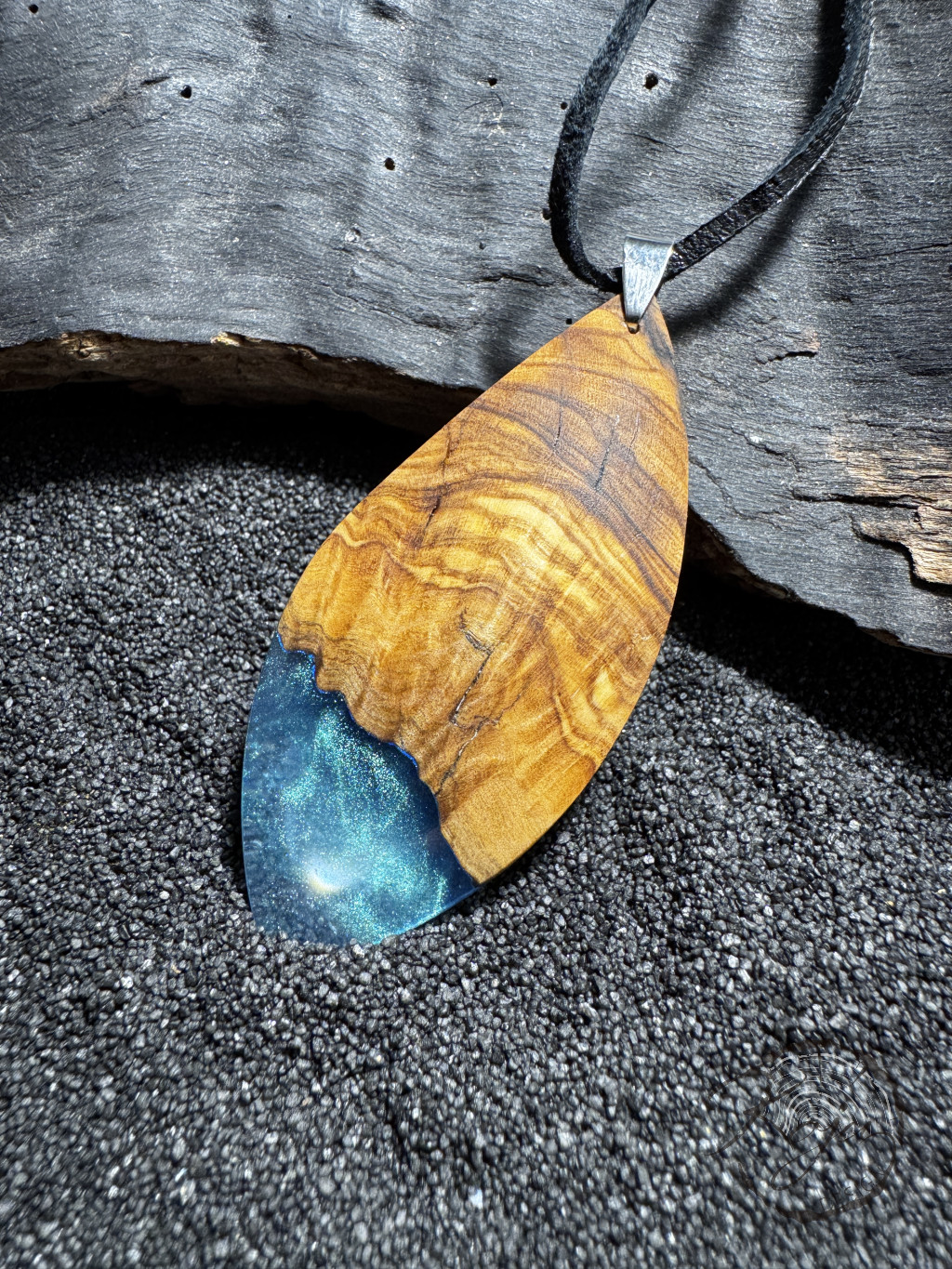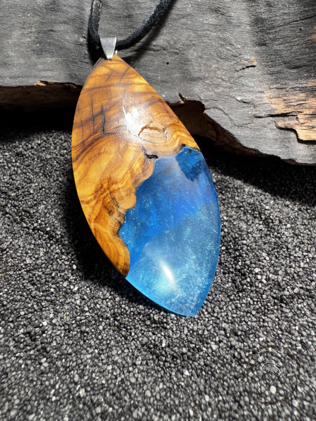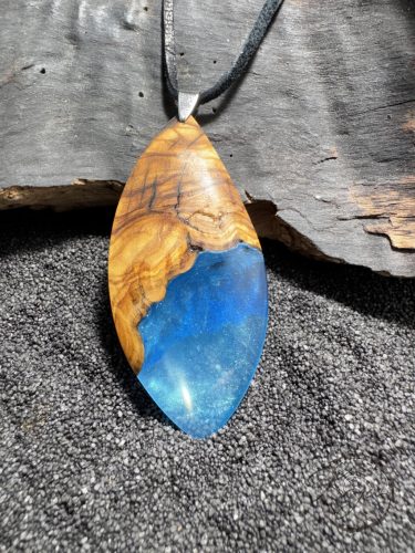 Gyönyörű tunéziai olivafa és halvány kék epoxy gyanta alkotja ezt az ékszert. A fa és a gyanta találkozásánál a medál foszforeszkál, sötétben rendkívülien világít.