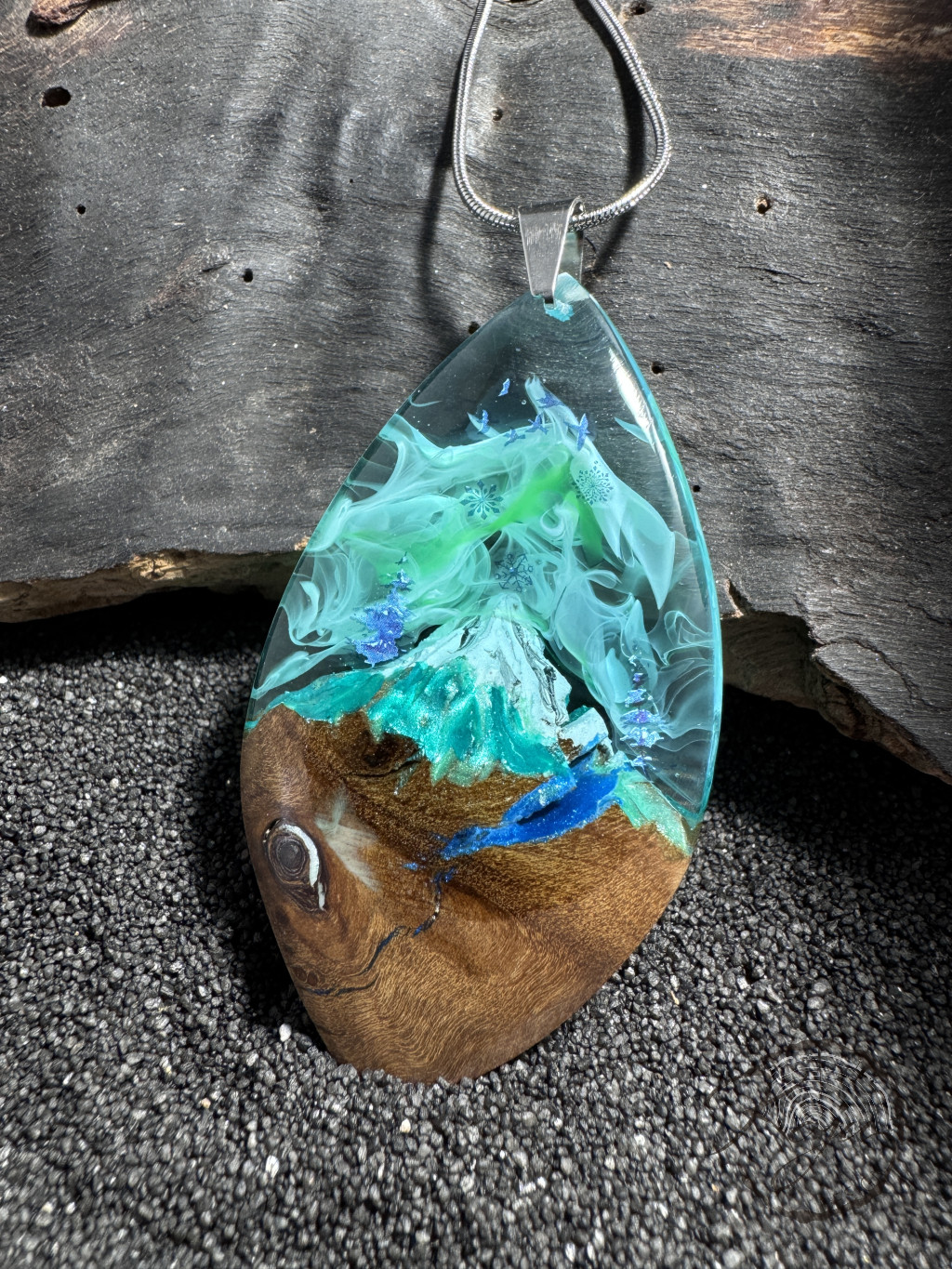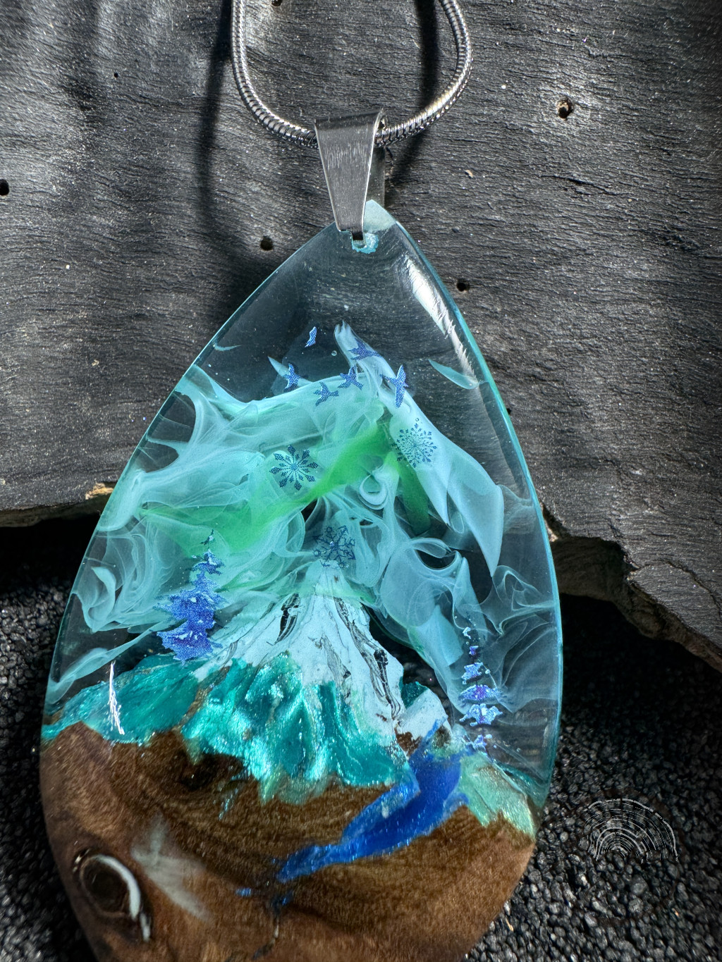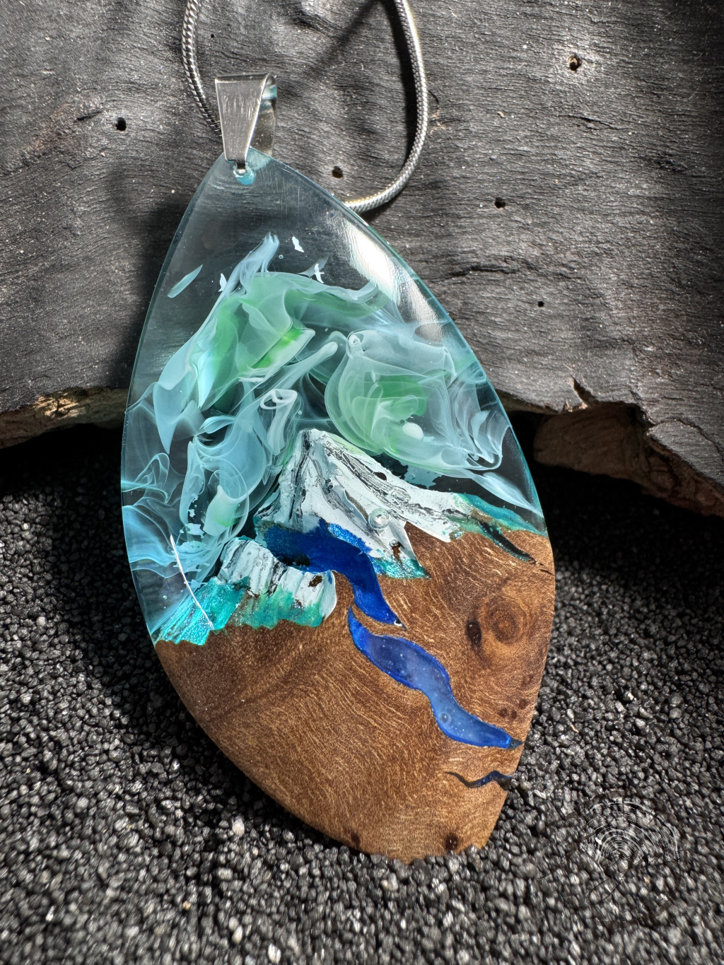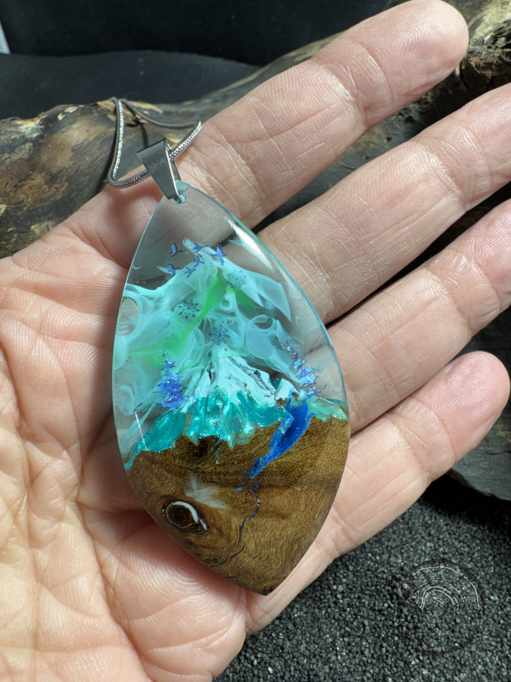 Egyedi és különleges hegyvidék medál, melyet bátran viselhetsz a mindennapokban vagy különleges alkalmakkor is. A medál egyedi megjelenéséért a foszforeszkáló pigment felel, melynek köszönhetően a sötétben is képes fényleni. A mini fenyőfával díszített medál alapja wenge fából készült, melynek elegáns és természetes megjelenése van.Apró kis részletek teszik még különlegesebbé, mint a szálló madarak, a fenyő és néhány hópihe. Ez a medál tökéletes választás lehet, ha szereted az egyedi ékszereket, amelyek kiemelkednek a tömegből. Különleges kivitelezésének és világító tulajdonságainak köszönhetően az estei alkalmakon is remek választás lehet, hiszen egy pillanat alatt feldobja az öltözékedet.