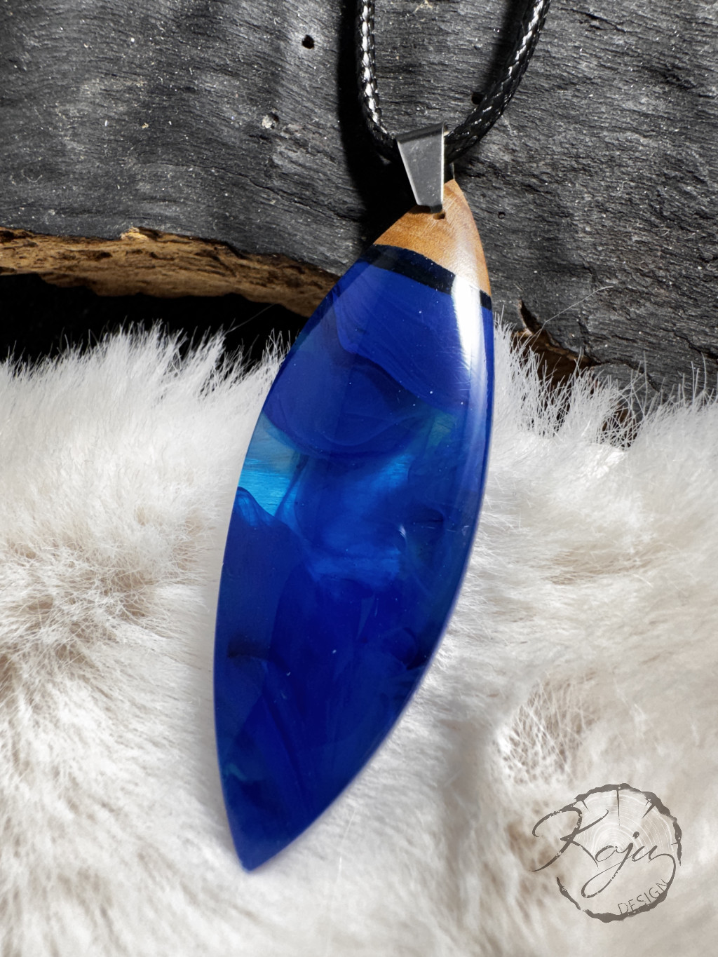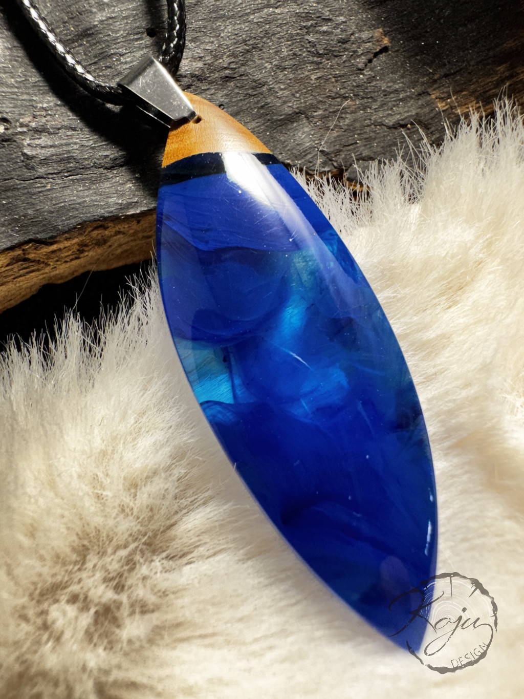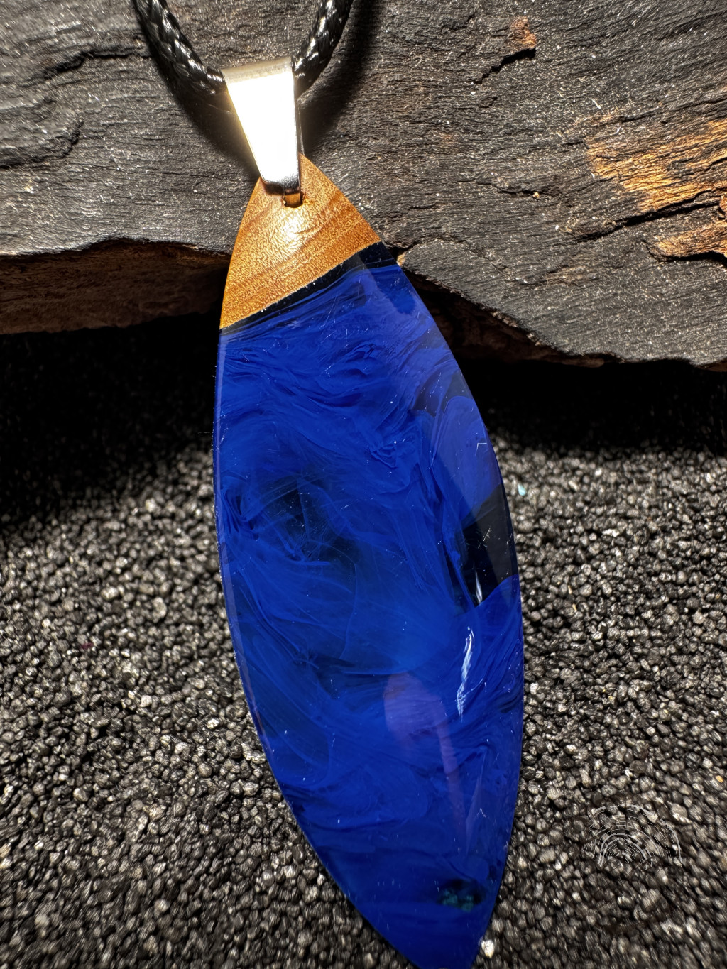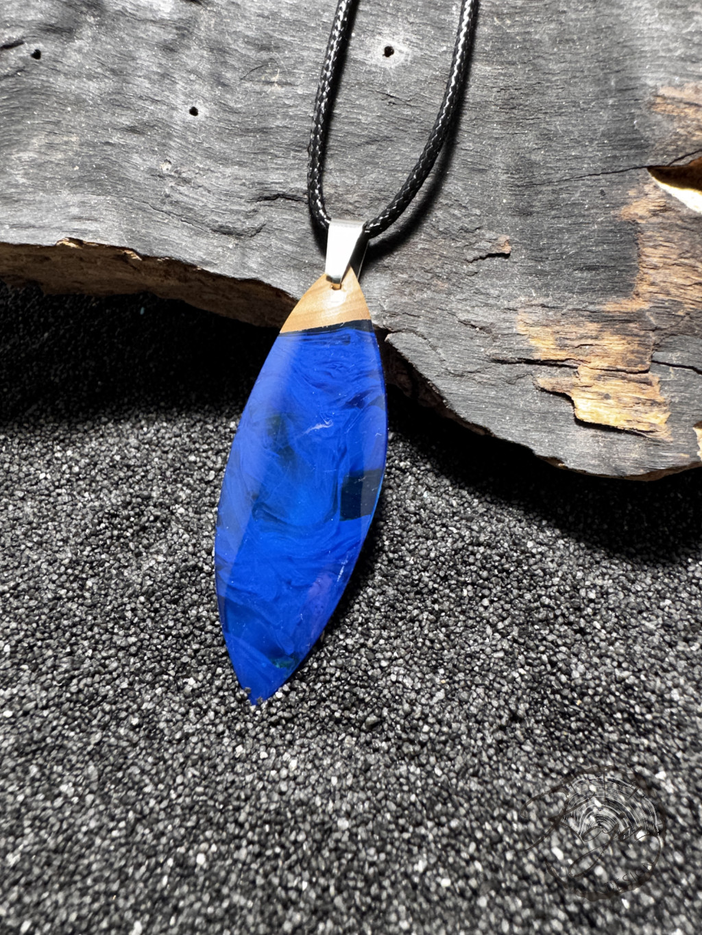 Kék áttetsző epoxy gyanta és egy kis darabka fa medál. Az epoxy gyantában sötétkék minta látható ami füstre emlékeztet.