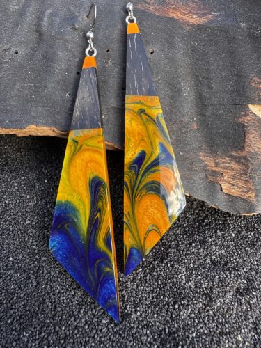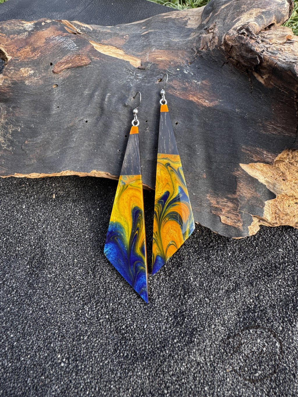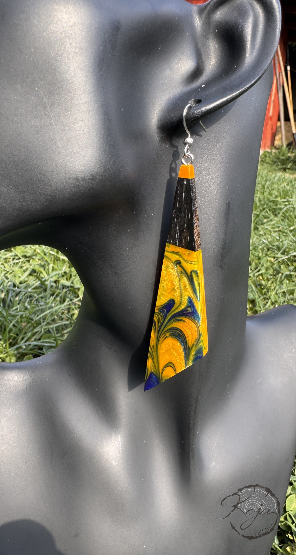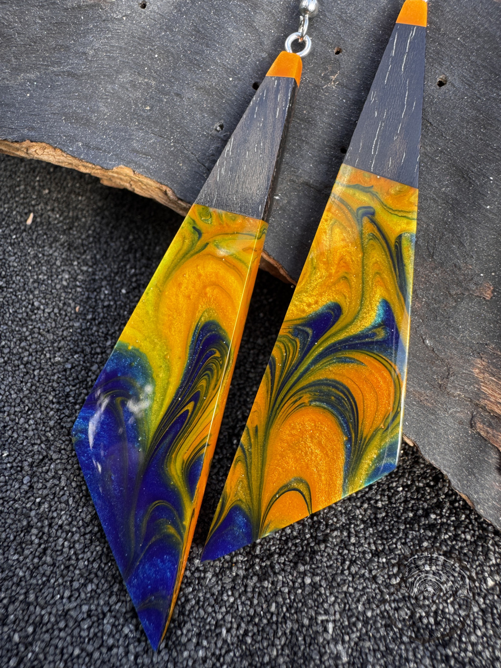 Narancssárga epoxy gyanta fülbevaló, melyben sötétkék minta kavarog. Gyönyörű, megismételhetetlen darab. A felső részen ziricota fa látható.