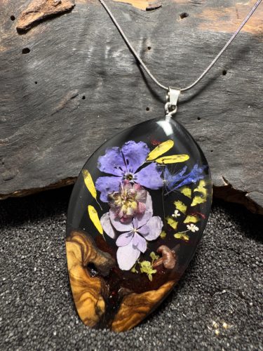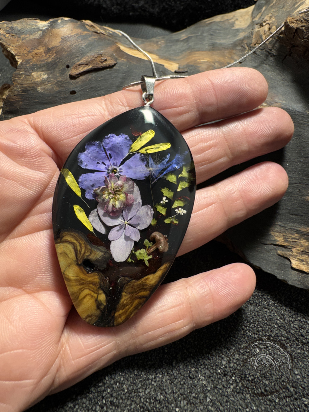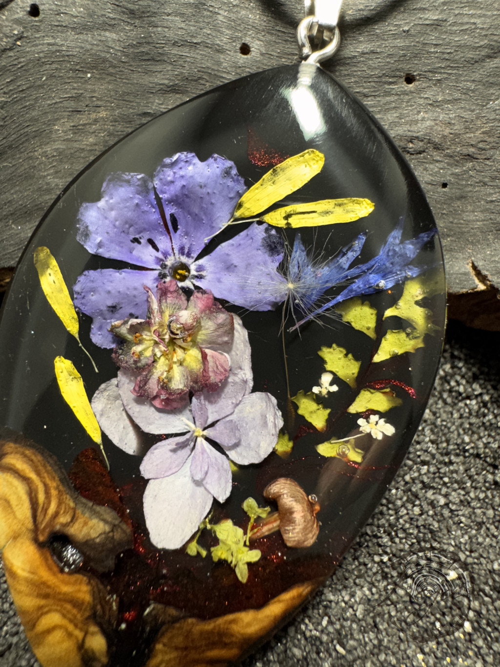 Lila virágok kerültek ebbe a medálba, kis gomba és más virágok társaságában. A fekete alap kiemeli a sok kis növénykét. Az áttetsző gyantában a virág minden kis része tökéletesen megfigyelhető.Az ékszer teljesen egyedi, kézzel készült darab. Minden ékszeremet kézzel formázom, előre gyártott sablont nem használok.