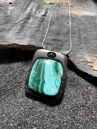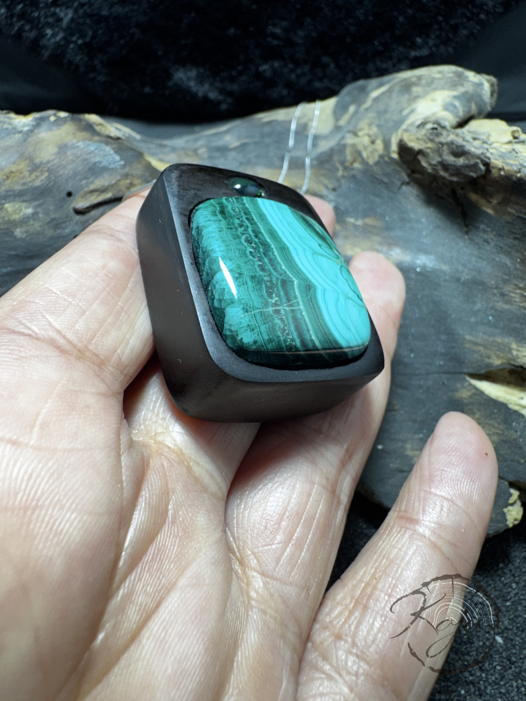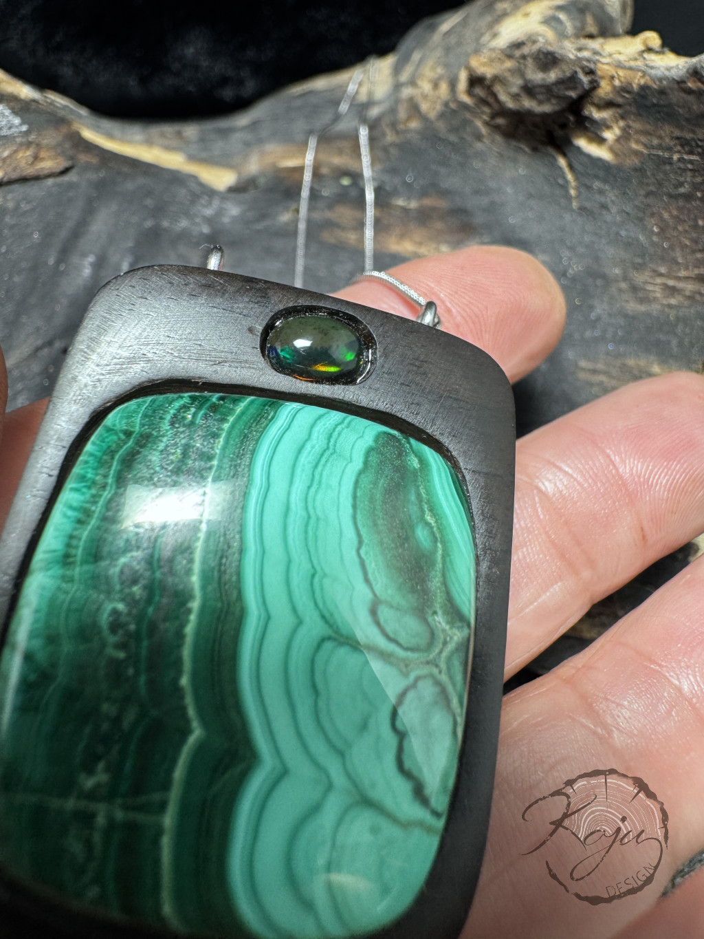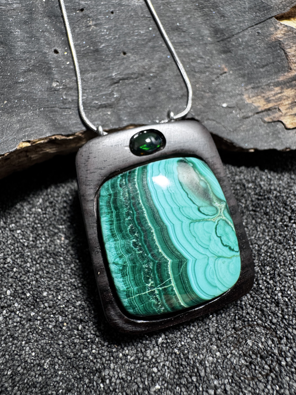 Gyönyörű szögletes malachit került ebbe az ébenfa alapba. Felette egy kis csiszolt fekete opál található, mely zöldes-pirosas-sárgás színben irizál. Különleges és nagyon egyedi darad!