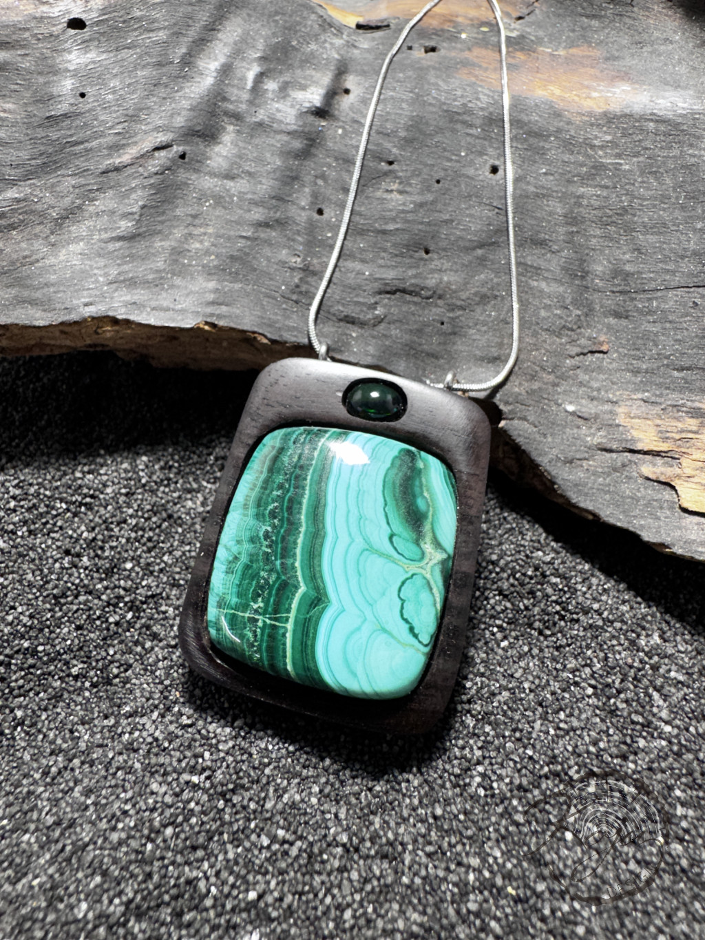 A kézműves kialakítás garantálja, hogy minden apró részlet egyedi, így biztos lehetsz benne, hogy egy valódi remekmű birtokosa leszel. Az ébenfa és a malachit ásvány csodálatos összhangja mellett a nemesacél lánc tartósságot és eleganciát kölcsönöz viselőjének.