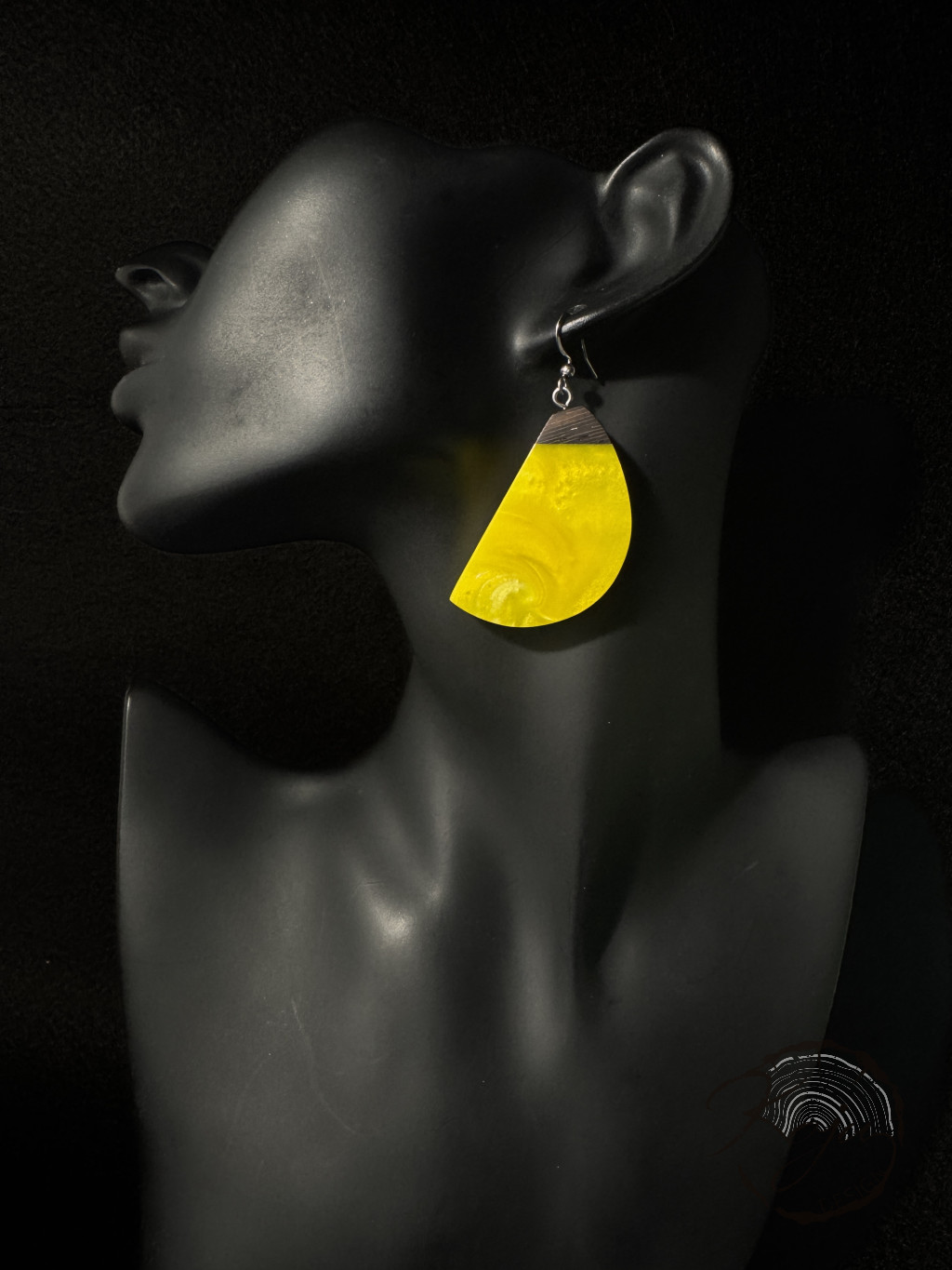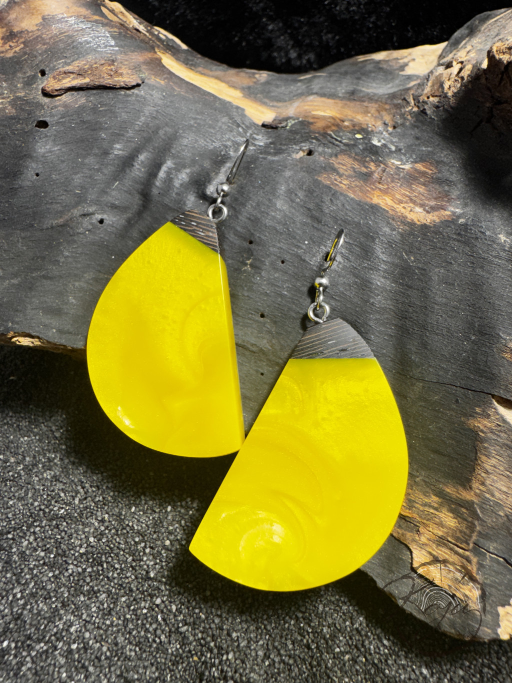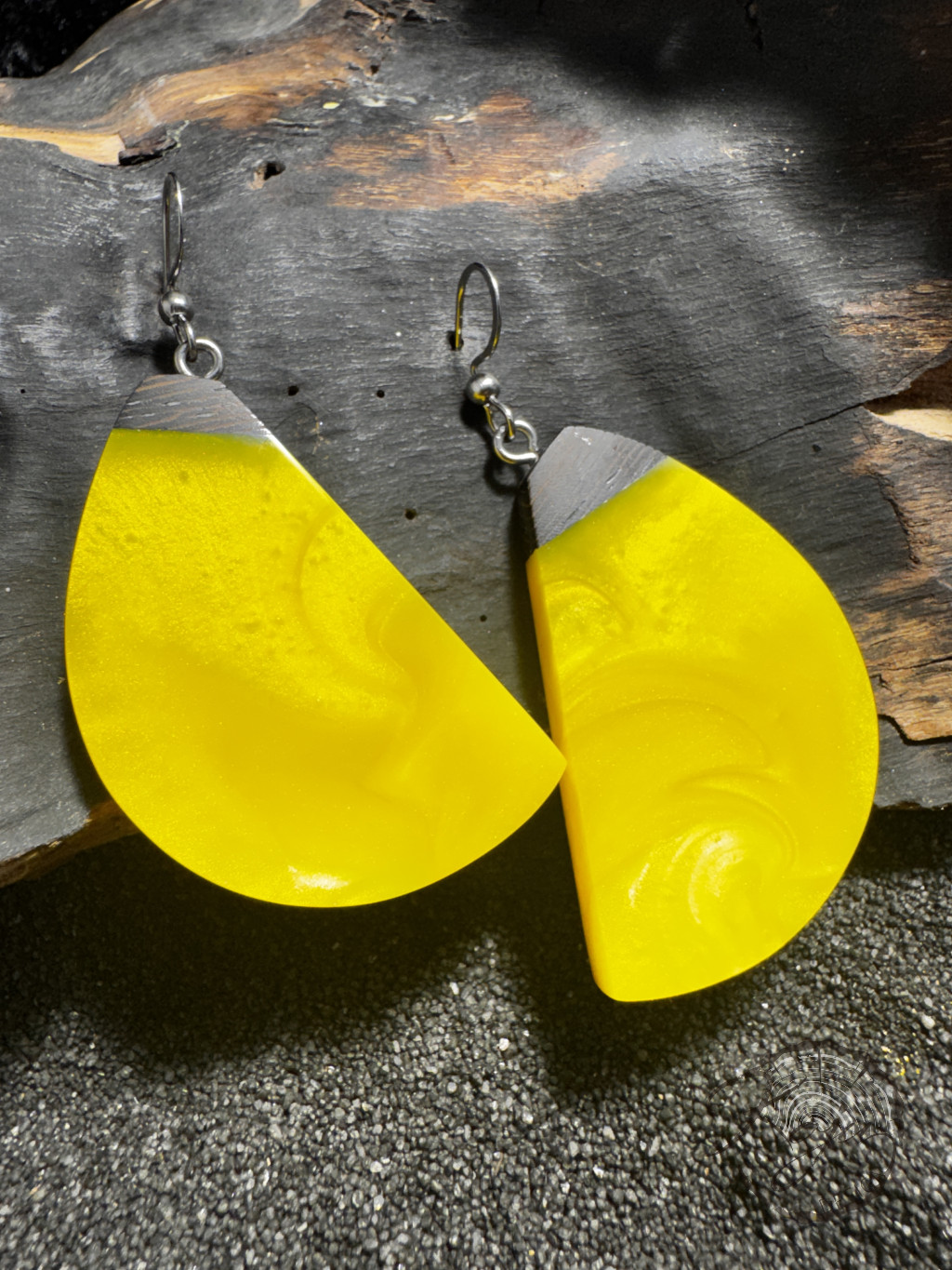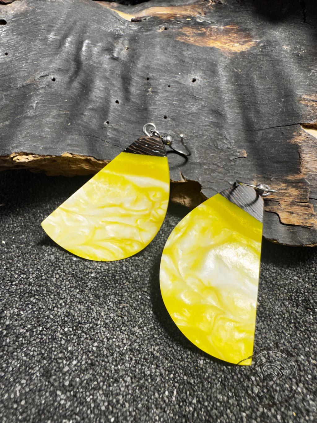 Citromsárga színű epoxy gyanta fülbevaló wenge fával. Az egyik oldala teljesen citromsárga, míg a másik gyöngyházfehérrel gazdagított.