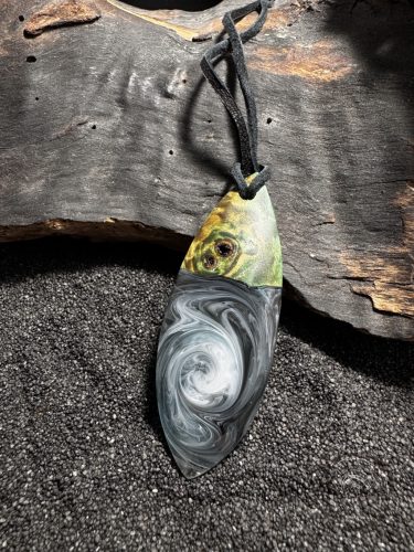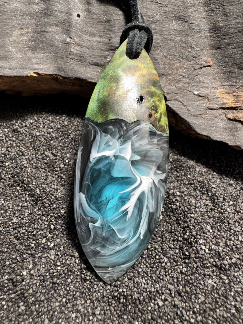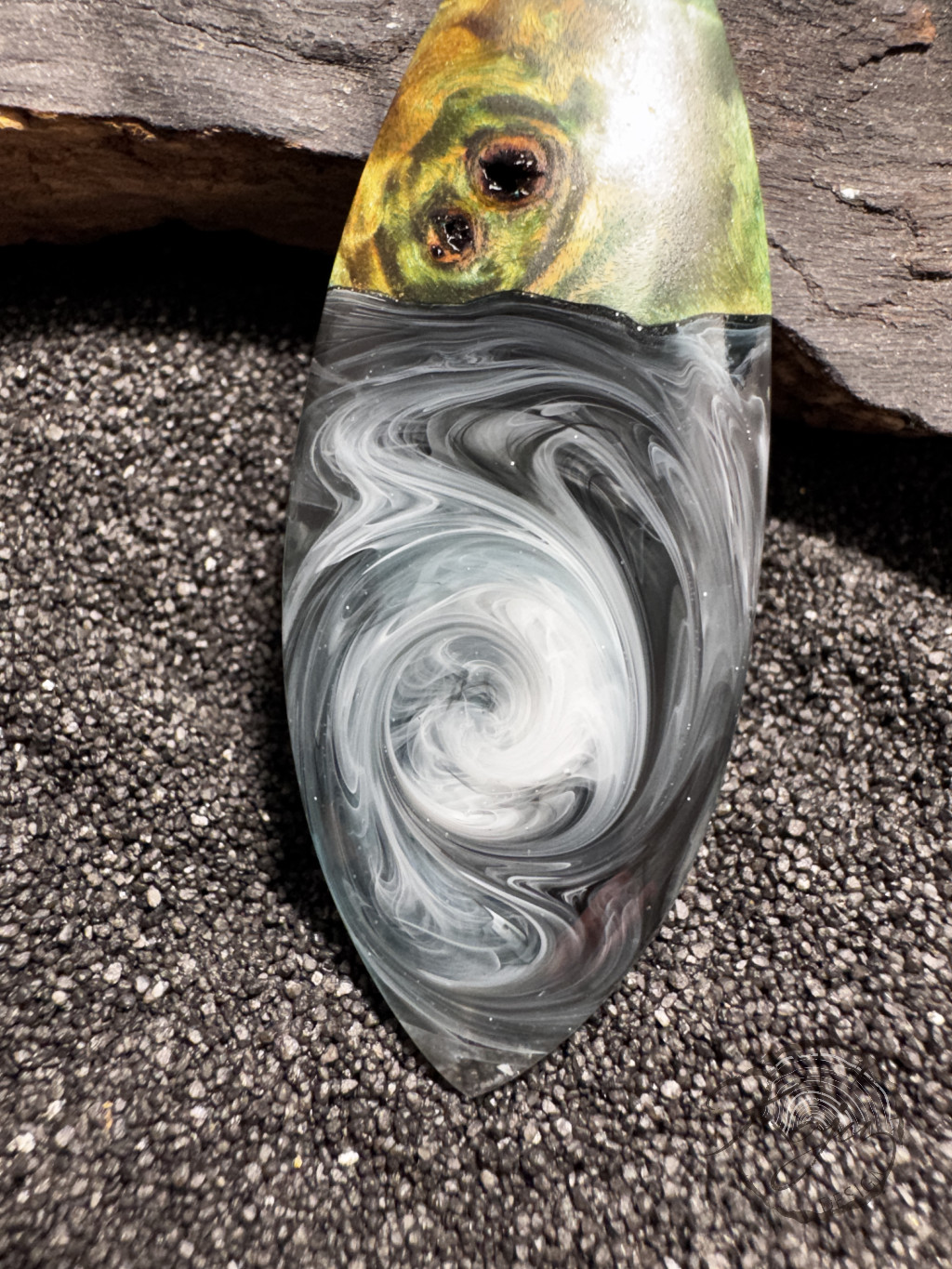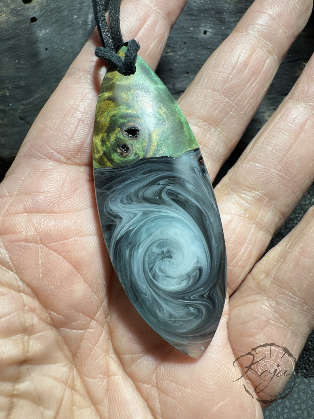 Stabilizált nyárfa és halványkék epoxy gyantából készült. Fehér és fekete vonalak egy örvényben kavarognak a medál közepén.