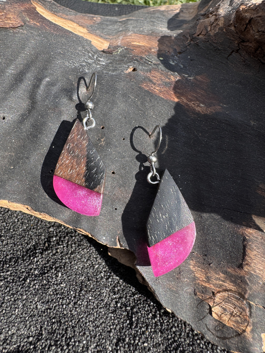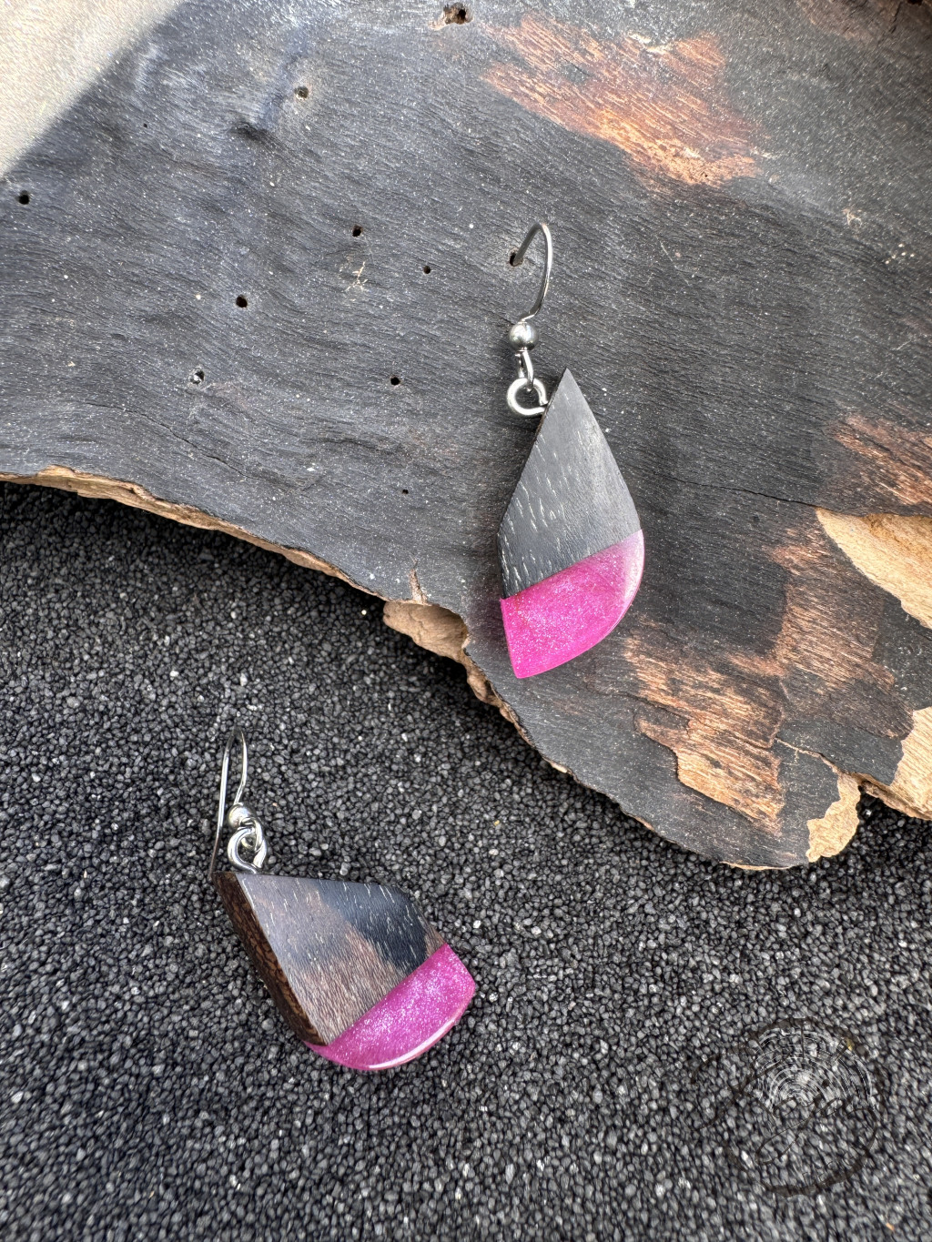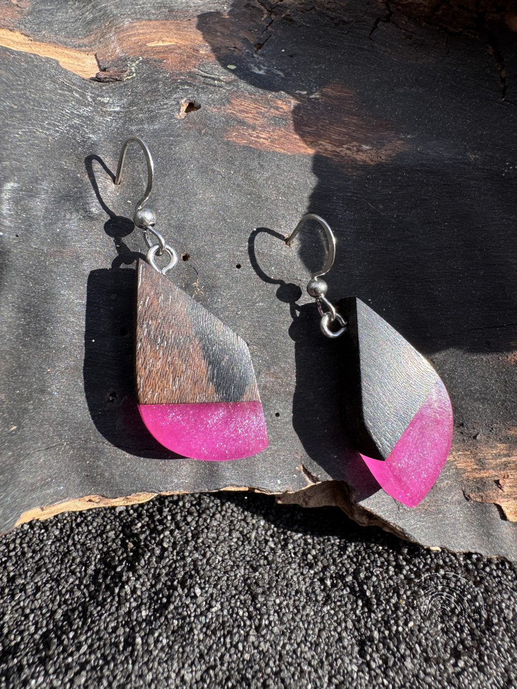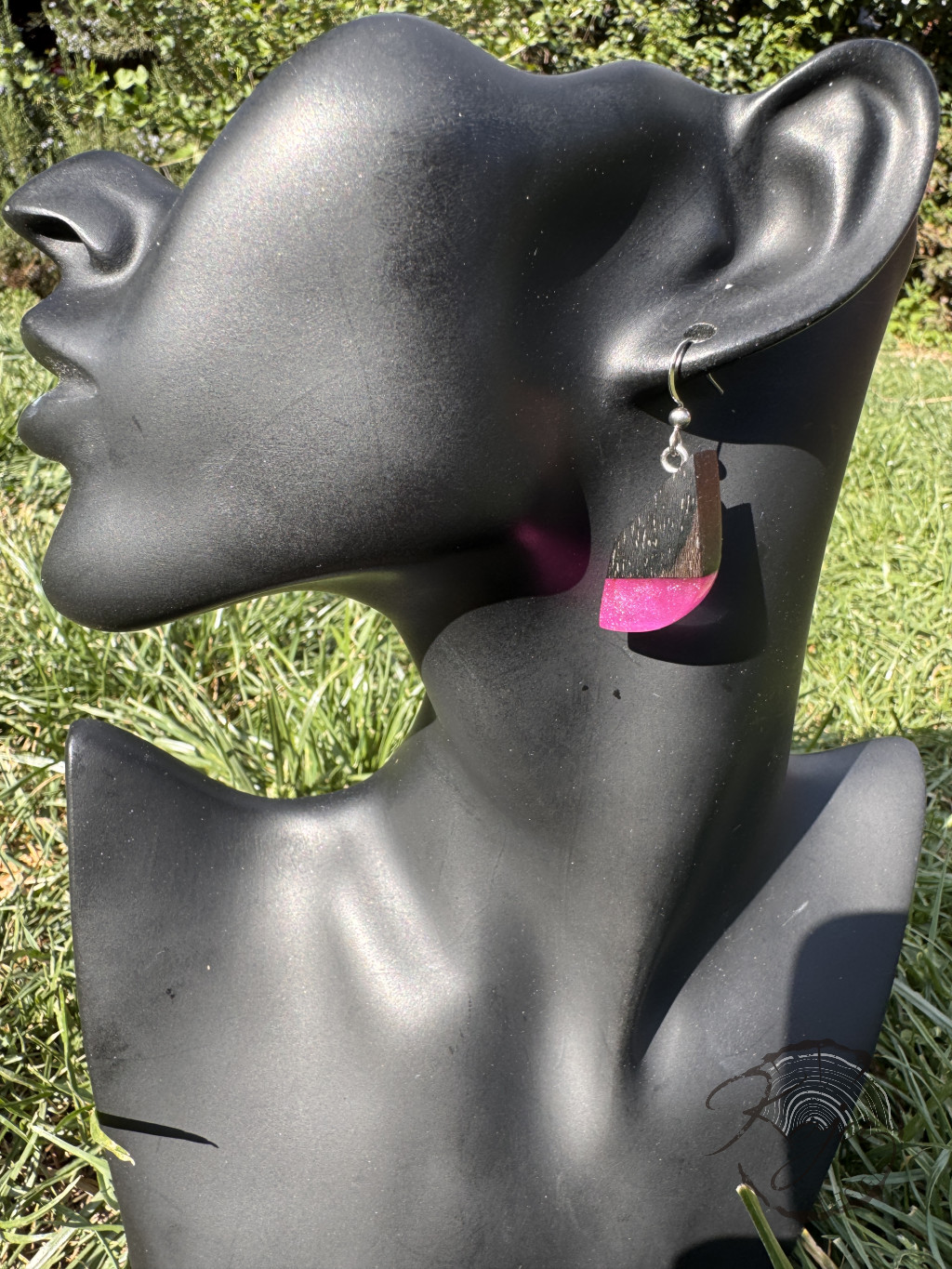 Pink színű epoxy gyanta fülbevaló. Sötét árnyalatú ziricota fa és rózsaszín epoxy gyanta ékszer.