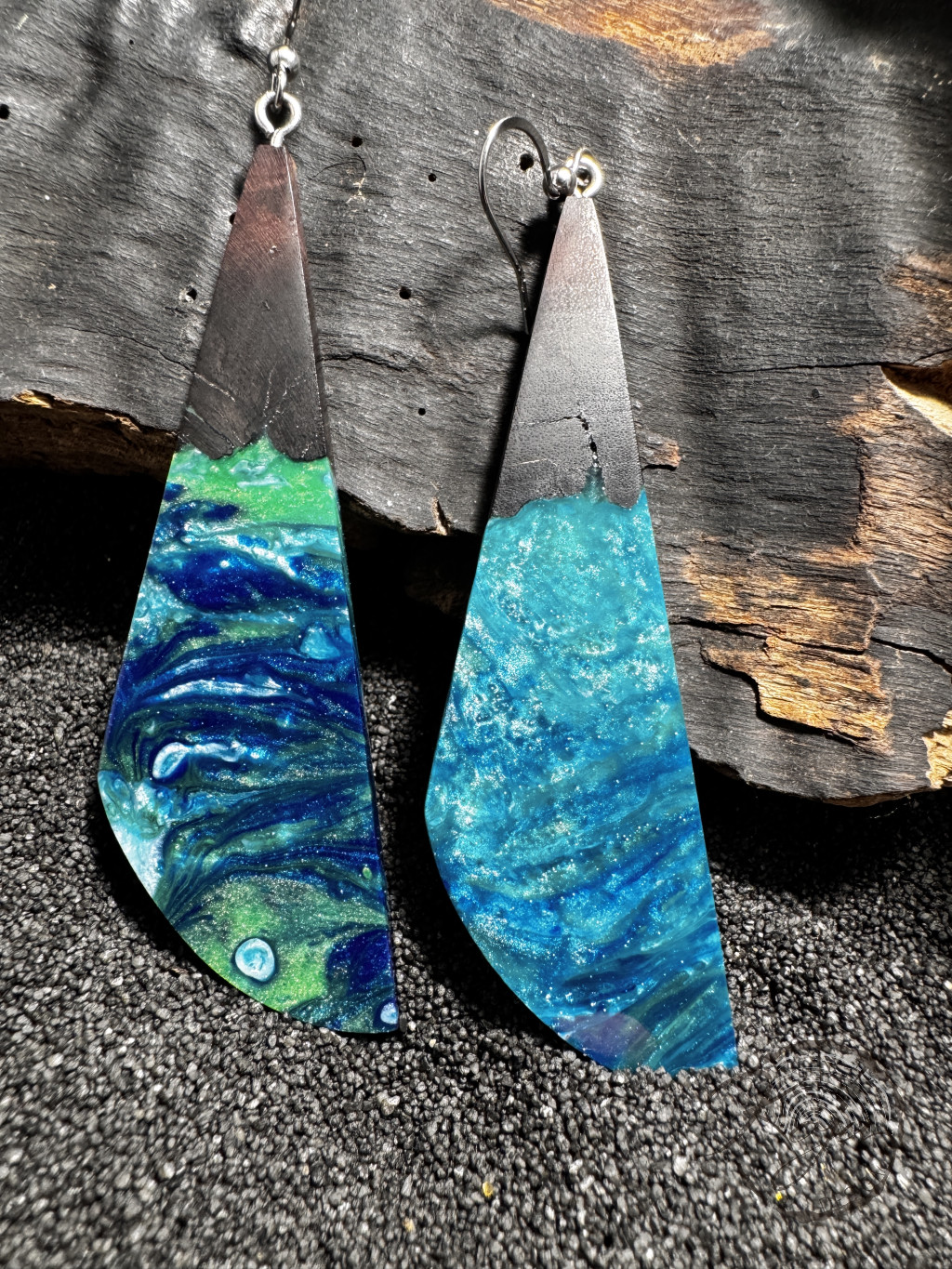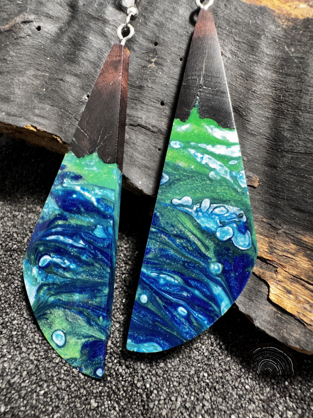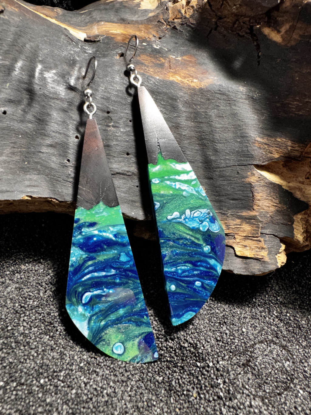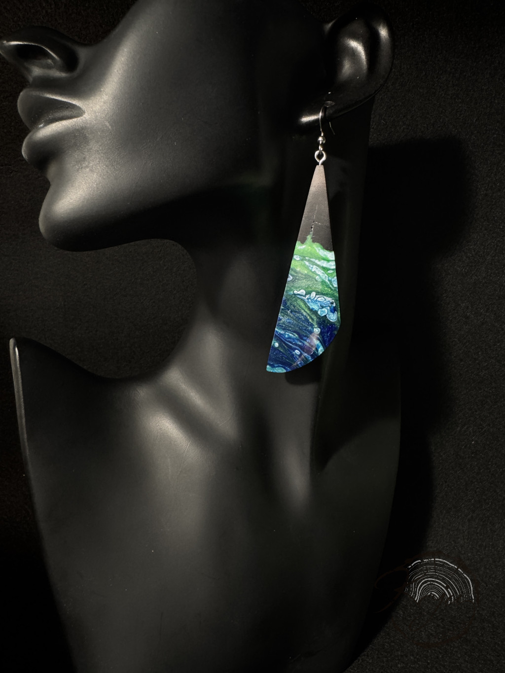 A kék és a zöld sok árnyalata megtalálható ebben a fülbevalóban, amely afrikai vasfából készült. Érdekes mintája igazán különleges, ami teljesen egyedi.