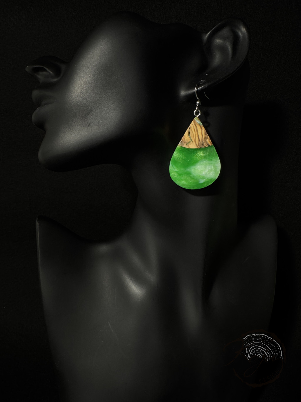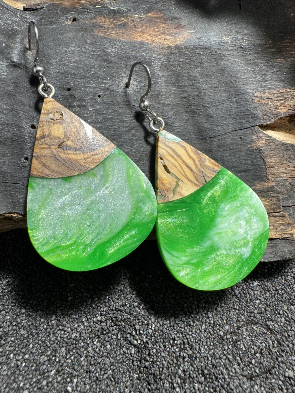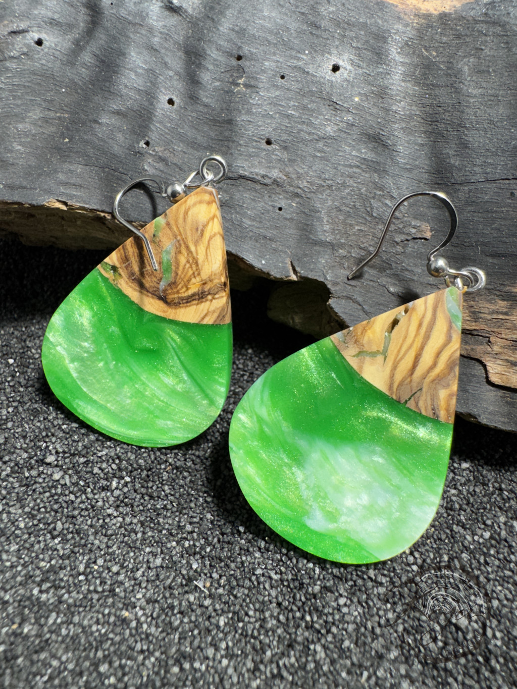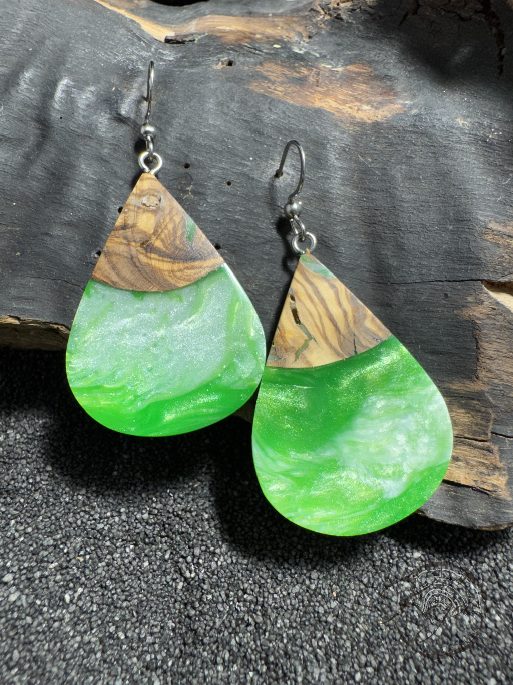 Csepp alakú, gyönyörű élénk zöld epoxy gyanta fülbevaló oliva fával. Különleges színe a zöld és a gyöngyházfehér epoxy gyanta kavarodásából született. Csepp formája igazán elragadó.