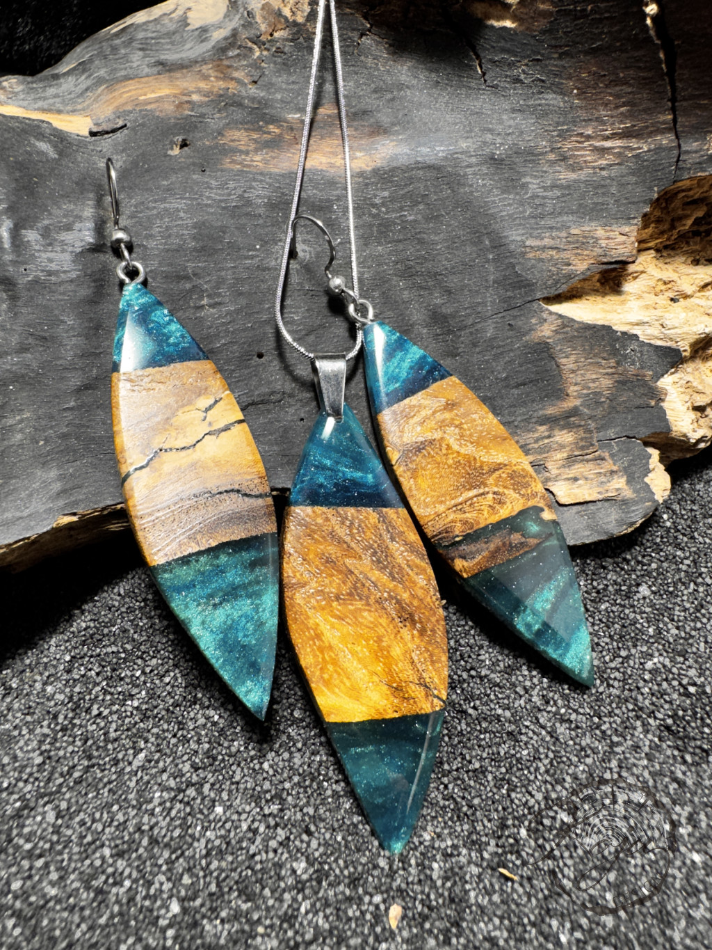 Nemesacél lánccal és szerelékkel.Különleges kézműves termék, melyből csak egyetlen darab készült és a fa és az epoxy mintájának egyedisége miatt nem is lesz több belőle.Mint minden termékem, ez is kézzel formázott, csiszolt és polírozott darab.Mérete:Medál: 6x2 cmFülvevalók: 5,7x1,8 cm