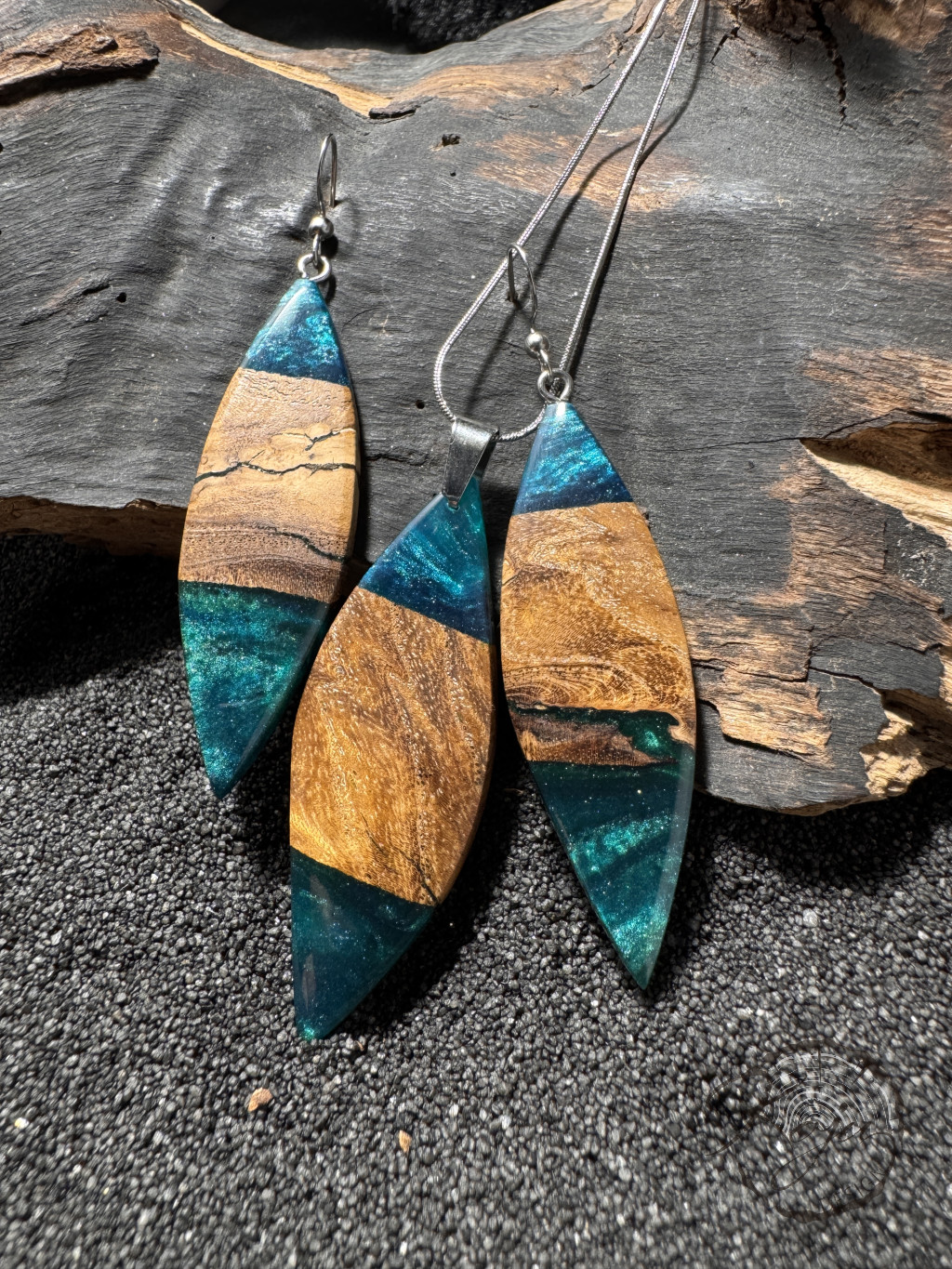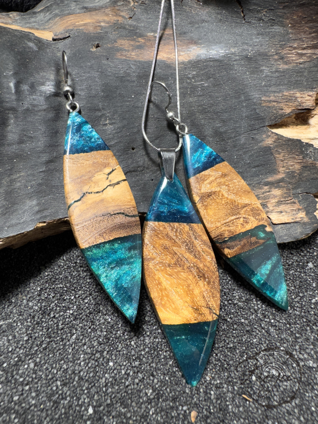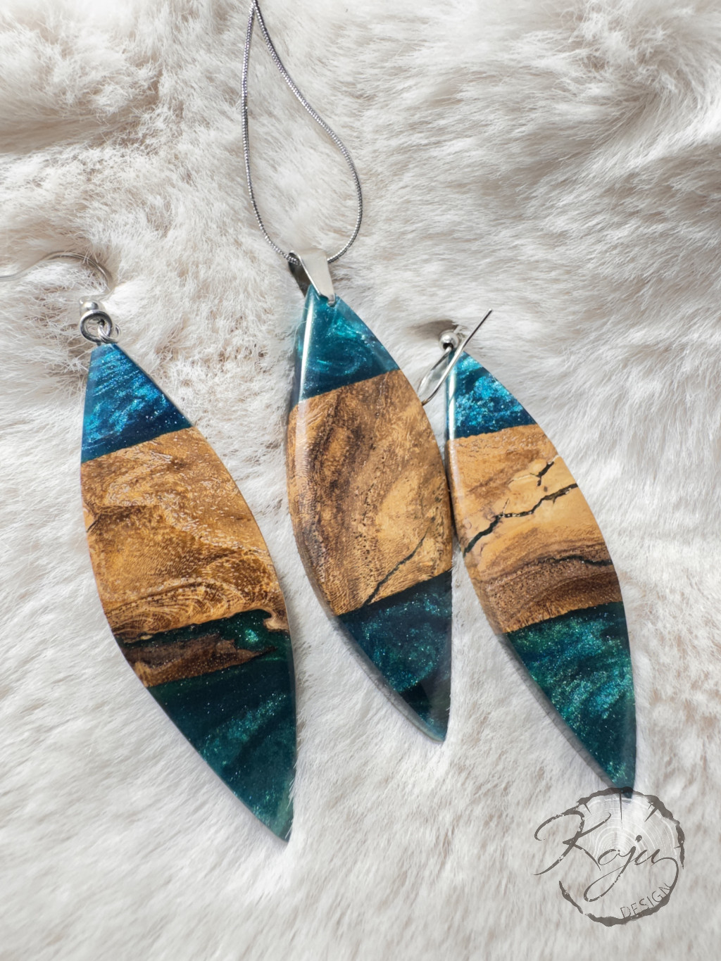Igazán különleges sötétzöld epoxy gyanta és fa ékszerszett.